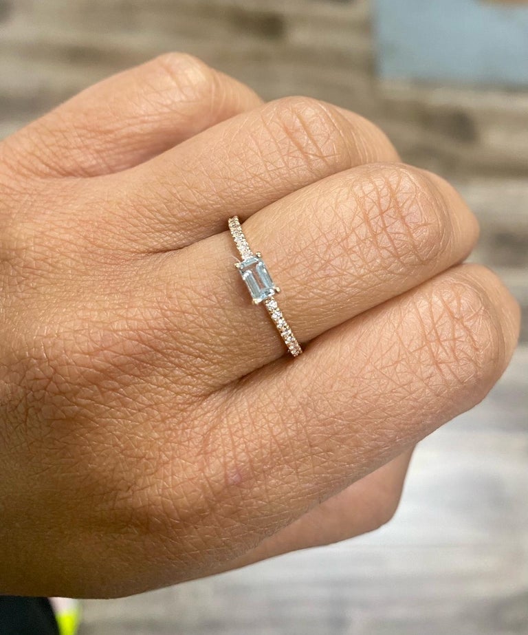 This ring has a Straight Baguette Cut Natural Aquamarine weighing 0.27 Carats and